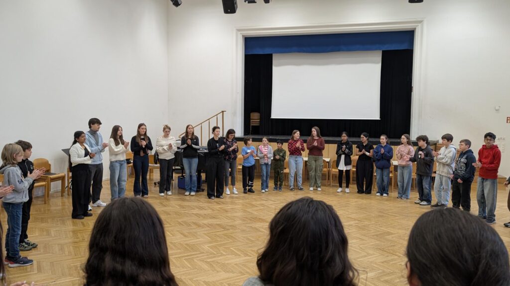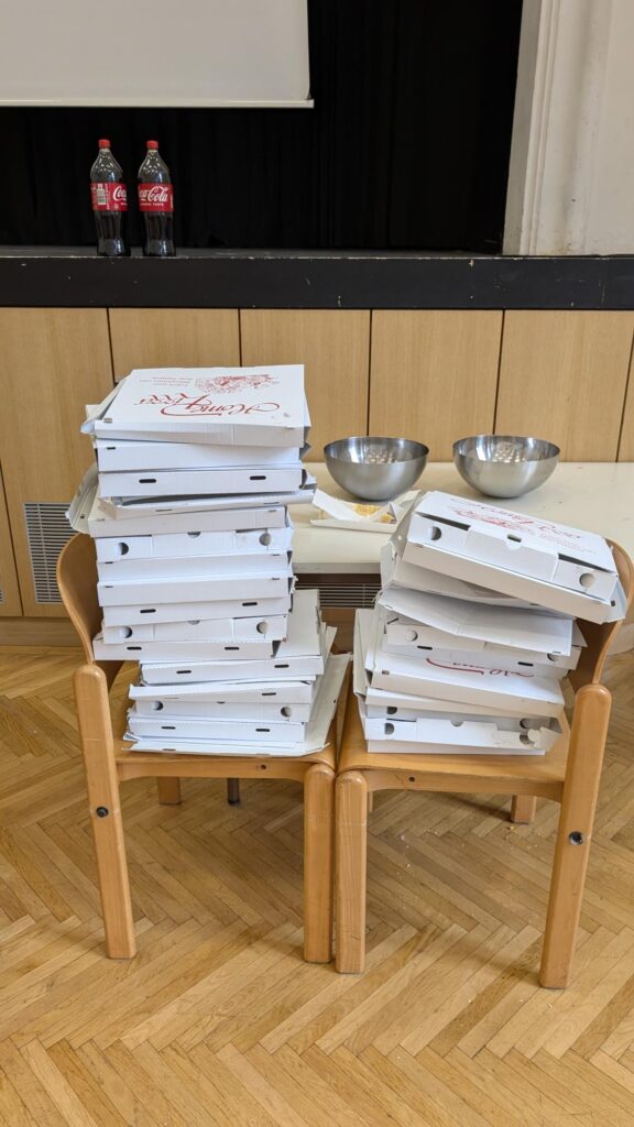 Nachdem unsere Schulchöre in diesem Jahr noch weiter gewachsen sind, war unser üblicher Probenort für diesen Tag nicht groß genug und wir durften auf unseren Festsaal ausweichen. Auch die Menge der Pizzen wurde selbstverständlich an den wachsenden Chor angepasst – danke an Prof. Wong für’s Schleppen von sage und schreibe 35 Pizzakartons.