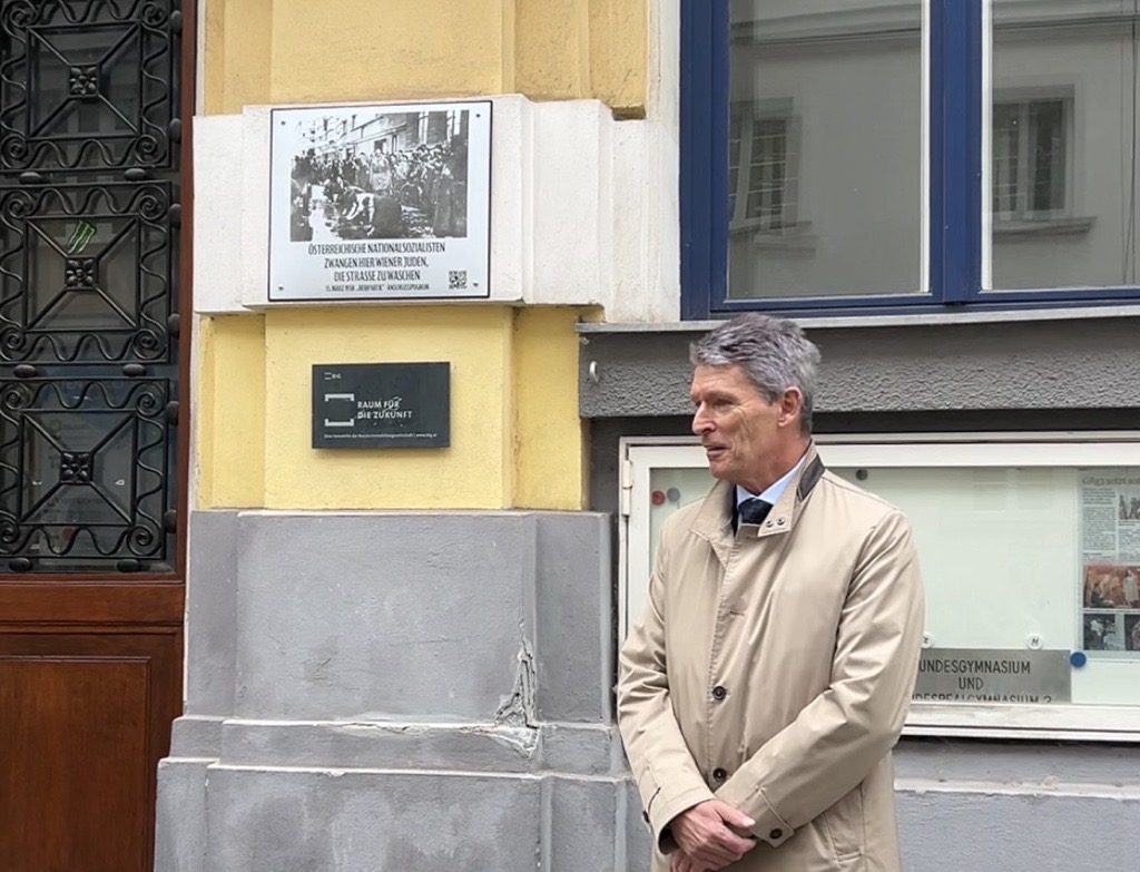 Nachdem durch unseren Direktor Mag. R. Baldauf und den Vorsitzenden des o.g. Vereins Mag. G. Burda der historische Hintergrund erläutert worden war, kamen Worte des Dankes durch die Bezirksvorsteher-Stellvertreterin Siegrid Widhalm. Anschließend wurde die Gedenktafel durch einen Schüler unserer Klasse 7B enthüllt – ein besonders wertvoller Moment, wurde hier die Kultur des Gedenkens an die Gräueltaten des NS-Regimes symbolisch an die nächste Generation weitergegeben.